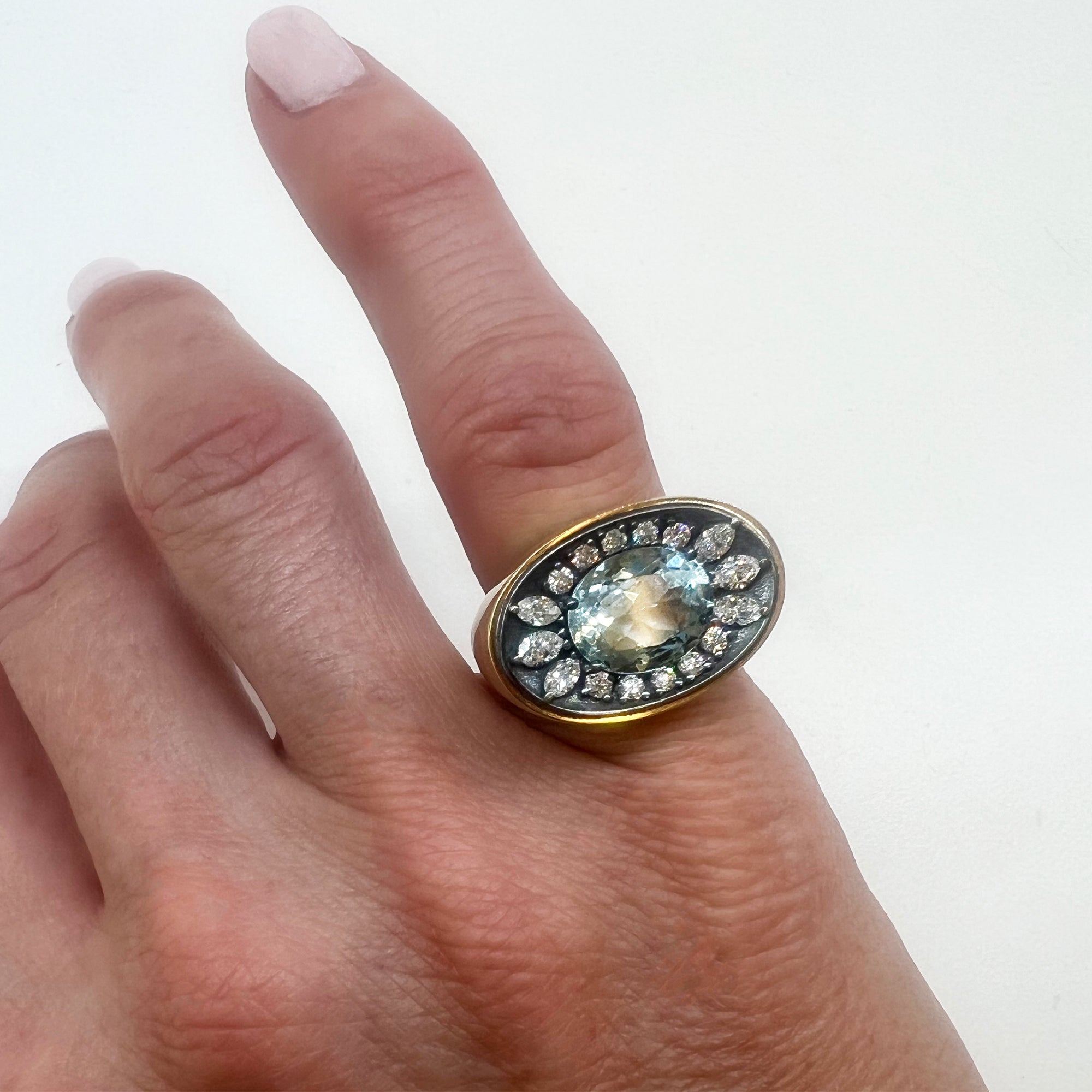 The original ring was pulled apart and stones were removed, polished and inspected for stability. Ray then designed an 18k yellow gold gypsy ring with recessed split claw set diamonds and claw set aquamarine center stone set against oxidized silver. The diamonds fan around the center stone giving it a snowflake feel, the stones pop and shine against the contrast of the oxidized silver.