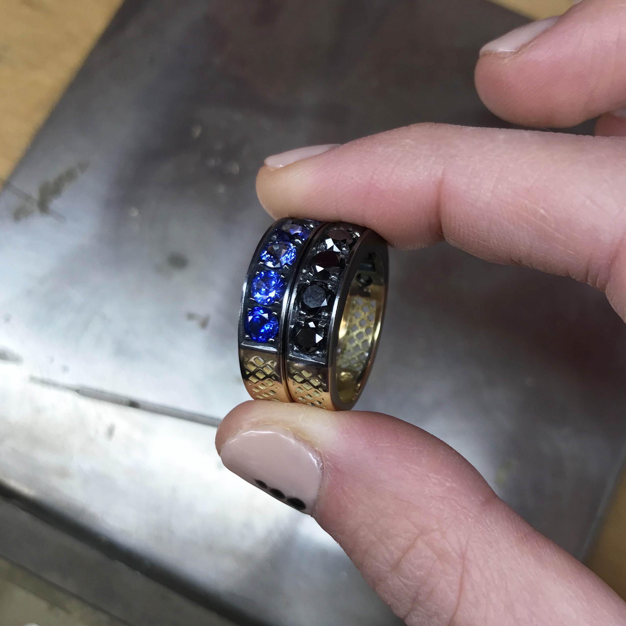 This was another collaboration with a fabulous collector, she had a 4mm white diamond eternity band that she wanted to stack with our stackers. As they were not the right width, Ray designed the perfect 4mm 18k Yellow Gold crownwork® bands with sapphire and black diamonds set in oxidized silver to stack on either side of hers.
