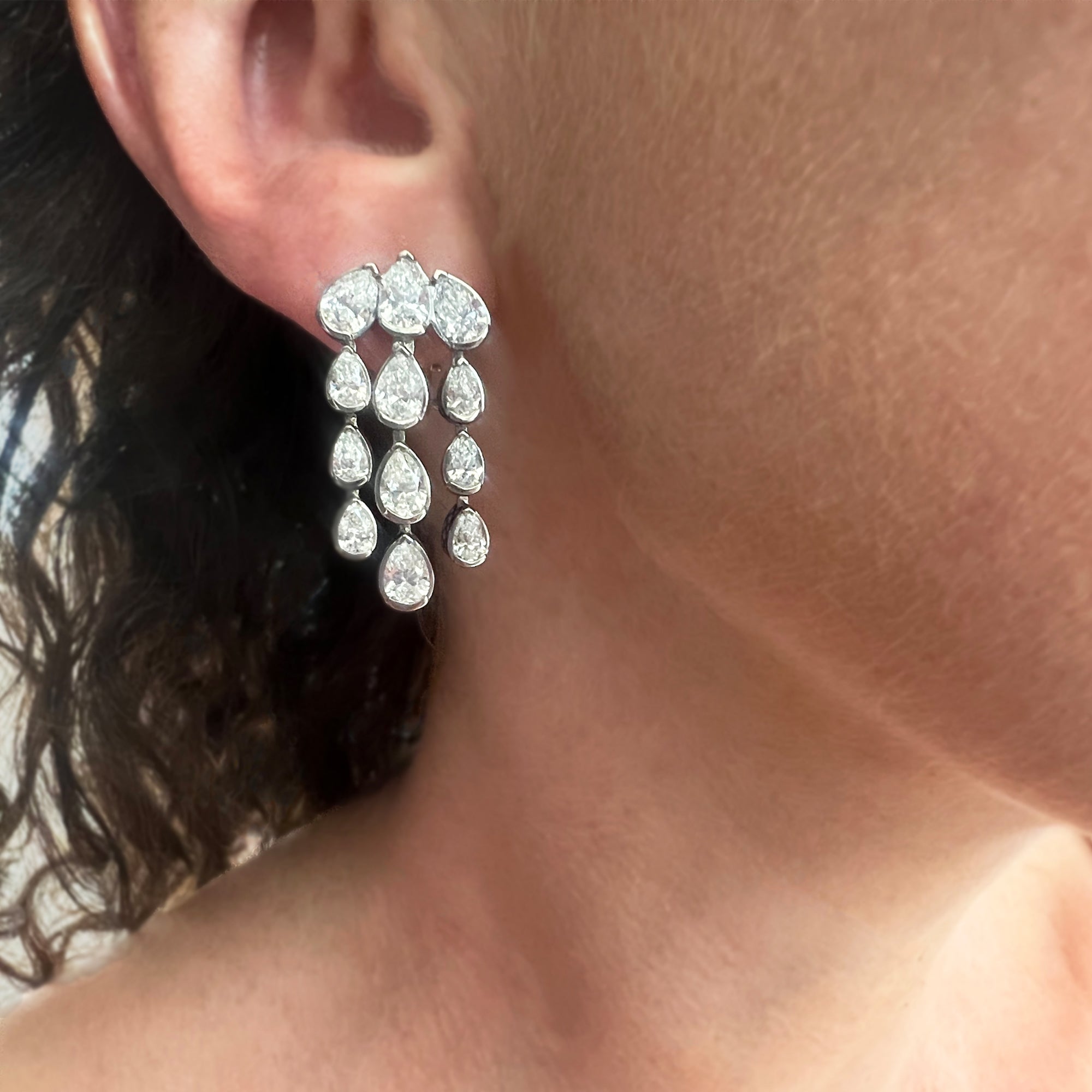 Ray drew up the design by hand beginning with an oval shape to understand the overall feel and proportion of the earrings. He then worked with our CAD designer to create a model. The 'waterfall' earrings feature 12 lab grown diamonds each in an individual crownwork setting. Each setting was slotted with a hinge into the one above it to allow for flow of movement.