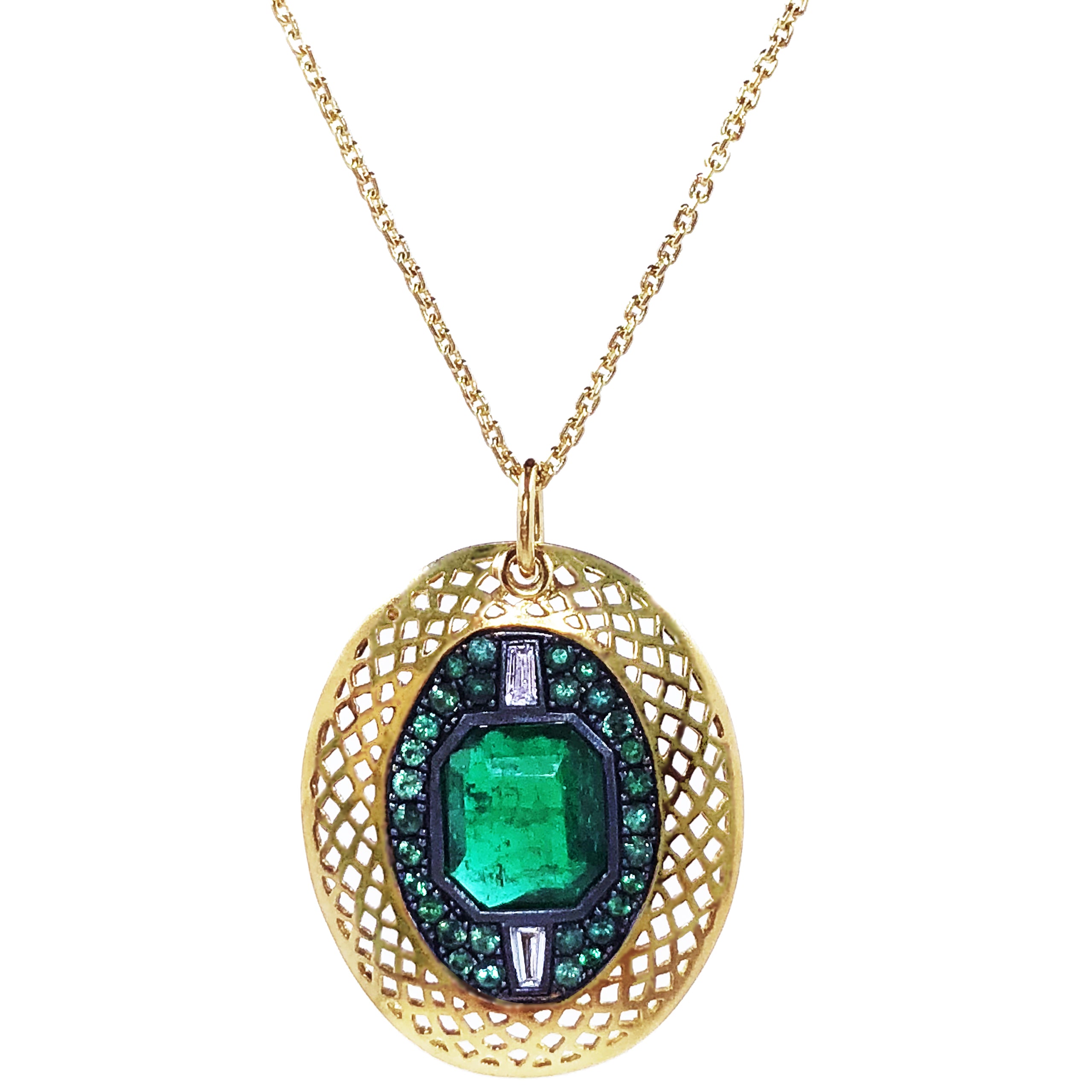 The diamonds were from her original engagement ring and she wanted a necklace that was easy to wear. With the pendant, Ray focused on the emeralds to retain the emotional value of their family history.