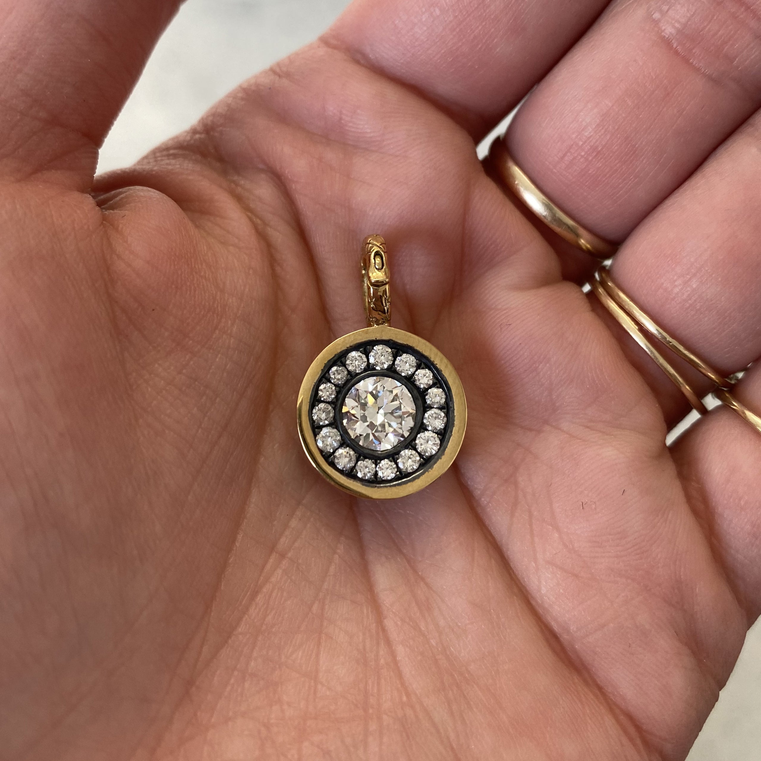 Ray pulled the diamonds from the ring, made an 18k Yellow Gold crownwork® pendant and set the center and surrounding stones in oxidized silver to really make them pop.