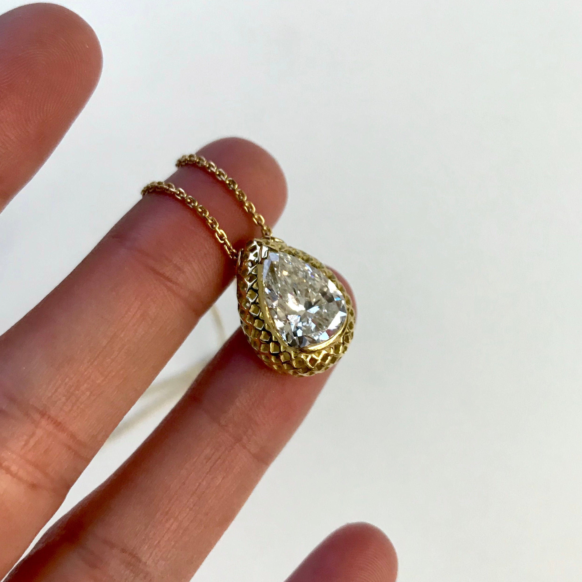 The stone in the pendant came from our client’s grandmother’s ring and was surrounded by diamonds. She and her sister split all their grandmother’s jewelry and she brought the pieces she didn’t wear to us. We made a beautiful solitaire Crownwork® pendant and then a pair of stick earrings and circle earrings with the surrounding diamonds. We recycled the gold and incorporated that into all the pieces too. New life for family heirlooms!
