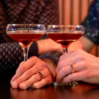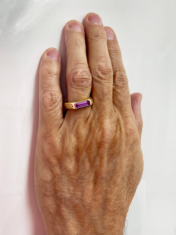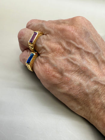 The design brief for these engagement rings was classic, clean and chic. Ray designed low profile bands in 18k yellow gold with crownwork all around the stones and ring. Emerald cut colored sapphires were sourced for each (blue and purple) and crisply bezel set in an east/west style so they can be easily stacked with future bands.