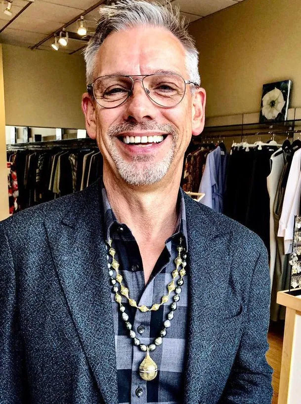 Jewelry connoisseurs routinely depend on Griffiths to restore important pieces. These he works on while wearing strands of organically shaped baroque pearls, some of them offset by his 18-karat gold Crownwork® beads.