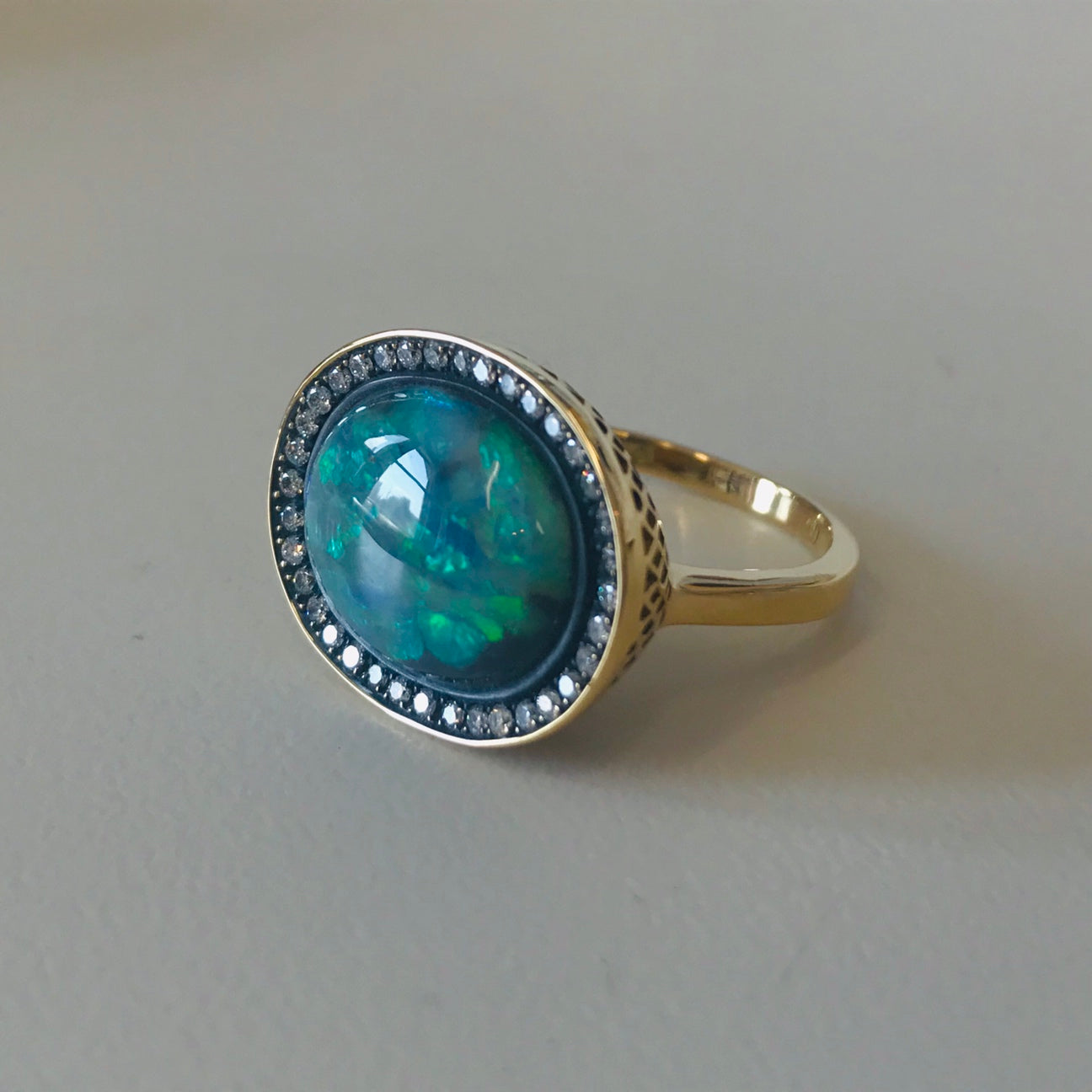 The client had a beautiful opal set in a ring she never wore. We polished the stone so the gorgeous colors would be on full display, and made an east west set Crownwork® ring with diamond surround in oxidized silver to really make it pop.