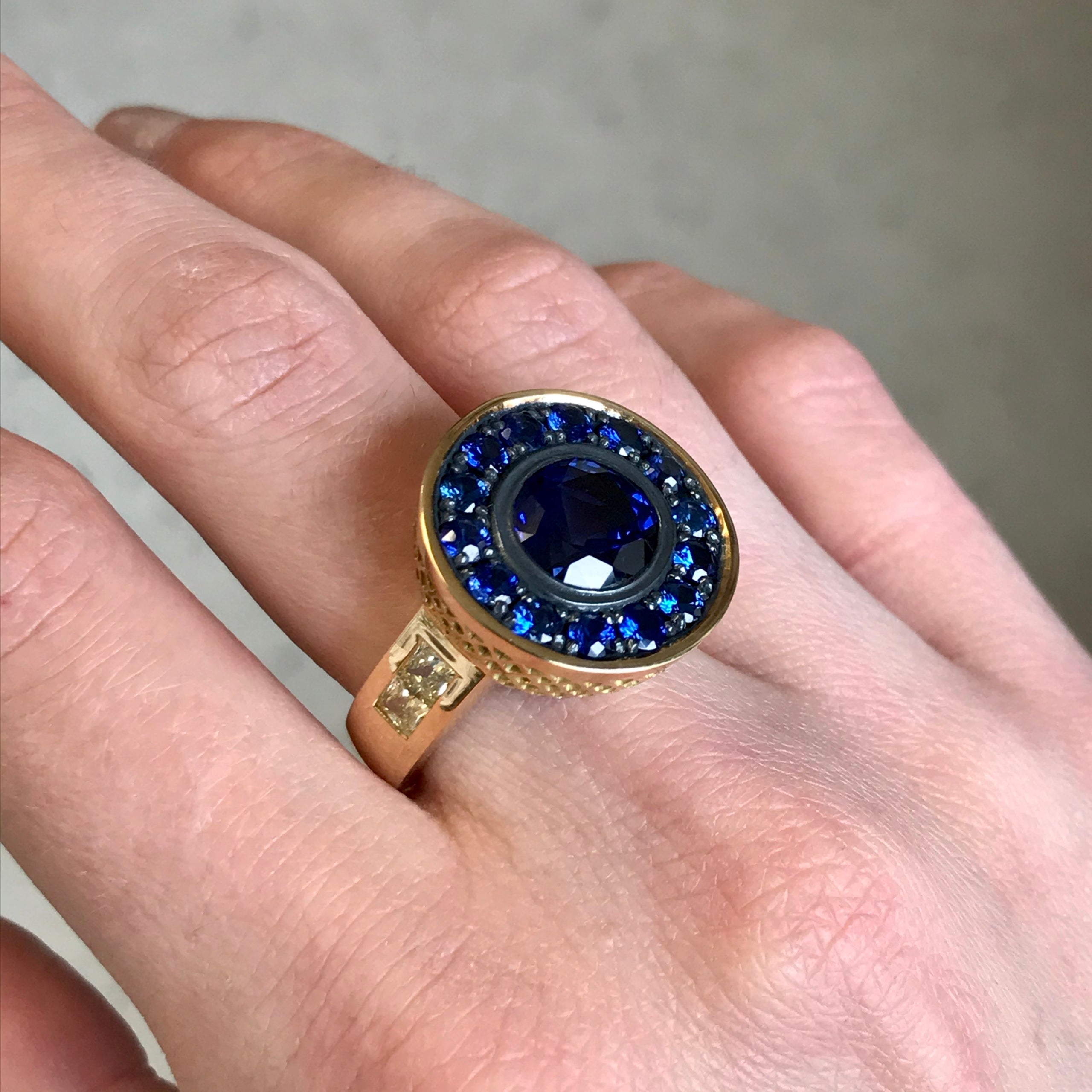 Our client came in with a blue sapphire and yellow diamond ring that she no longer wore. I immediately knew that the sapphire would look fabulous bezel set east west in oxidized silver with small stones set around. The diamonds were the perfect shape to be set on the shoulders. The client approved the sketch and we got to work! I think it’s the perfect use of her stone and she now has a ring she will wear and cherish for years to come.
