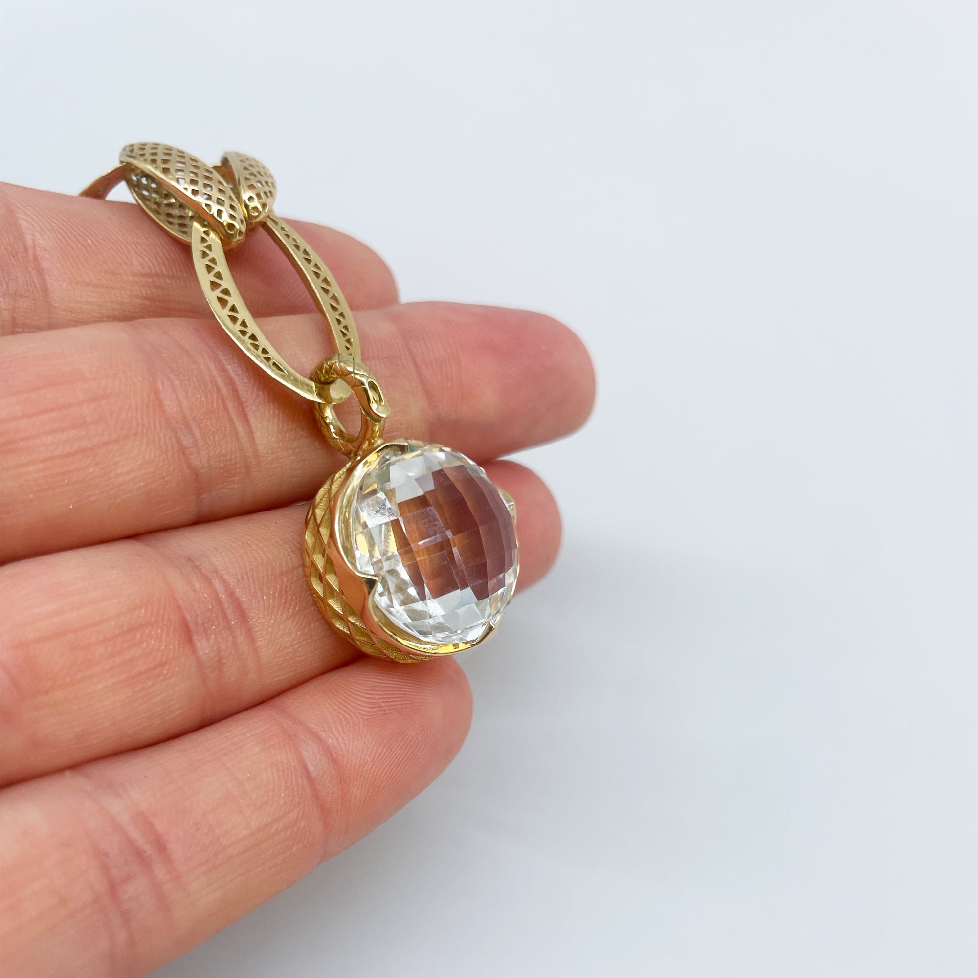 Ray designed a custom claw pendant to fit the stone. The 18k yellow gold Crownwork® pendant with pointed claw setting shows off the stunning white topaz stone. The client has an 18k yellow gold accent crownwork link necklace with oxidized silver chain and diamond toggle which Ray kept in mind when designing the pendant. The pendant was finished with a detachable bale so it can be easily removed and worn on different chains if desired.