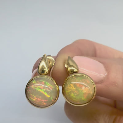 This is a beautiful pair of 12mm cabochon opals that have been bezel set in our classic crownwork® style and finished with teardrop tops on posts. The teardrop tops are curved in the back to wrap around the earlobe to give the earring stability and beautiful movement. A unique, wearable earring you will put on and not want to take off.