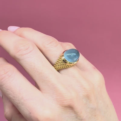 This striking ring features a domed aquamarine bezel set in our trademark 18k yellow gold Crownwork®.