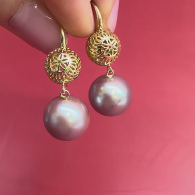 18K Yellow Gold Crownwork® Ball Top Earrings with Purple Freshwater Pearl Drops