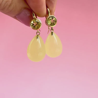 Green citrine is prized for its exceptional clarity and pale chartreuse sparkle, while the cabochon lemon quartz drops offer a luminous, milky glow that catches the light beautifully. Both stones are associated with positivity, creativity, and joy. The perfect gemstones for lifting your mood and your look.