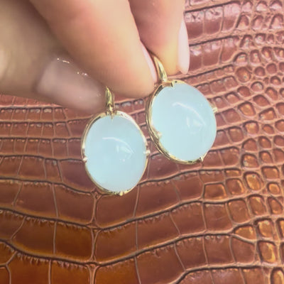 These gorgeous aquamarine earrings feature juicy cabochon aqua's set in an oval claw setting with our trademark Crownwork® frame reminiscent of the gothic period. The serene blue aquamarine showcases its tranquil color and luminosity, creating an elegant statement that catches light beautifully.