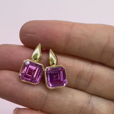 These chic earrings feature our classic 9mm emerald cut pink topaz bezel set in trademark Crownwork®. The teardrop post allows the earrings to drape beautifully on the ear with a light, open feel, showcasing the translucent beauty of the gemstones from every angle. A clever swivel design ensures they move naturally with you throughout the day.