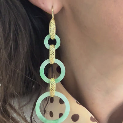 These show stopping shoulder dusters feature three carved jade circles connected by our trademark Crownwork® links in 18k yellow gold. The graduated jade rings create a super chic and fun cascade of movement with effortless drama. The natural variation in each stone's green hue makes the beauties uniquely beautiful.