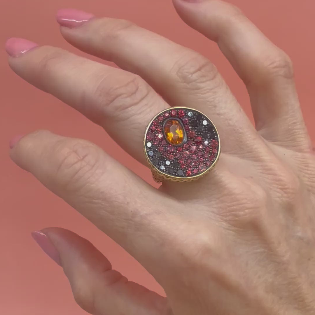 This exceptional one of a kind signet ring draws inspiration from historic pontiff intaglio rings used for wax seals, reimagined through our signature 18k Crownwork® technique. This beauty features a luminous oval orange garnet surrounded by a dramatic pavé setting of vibrant orange and red sapphires interspersed with black diamonds, all set in a concave oxidized silver base. The arrangement creates a mesmerizing volcanic effect - glowing orange and red gemstones erupting from the dark depths like molten lava.