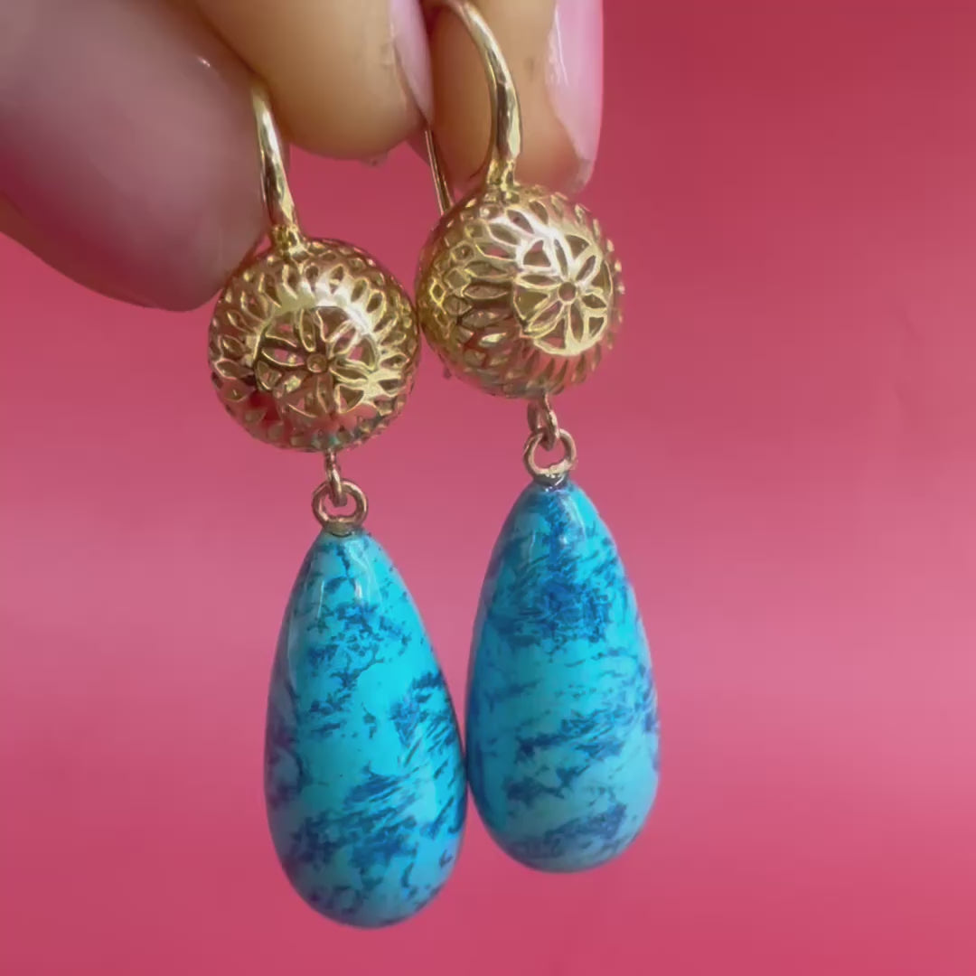 These stunning earrings feature our trademark 10mm Crownwork® ball tops in 18k yellow gold paired with elongated chrysocolla & azurite teardrop drops. The vibrant turquoise blue of the chrysocolla is beautifully laced with deep cobalt veins of azurite, creating a striking natural pattern that makes each pair truly one of a kind.
