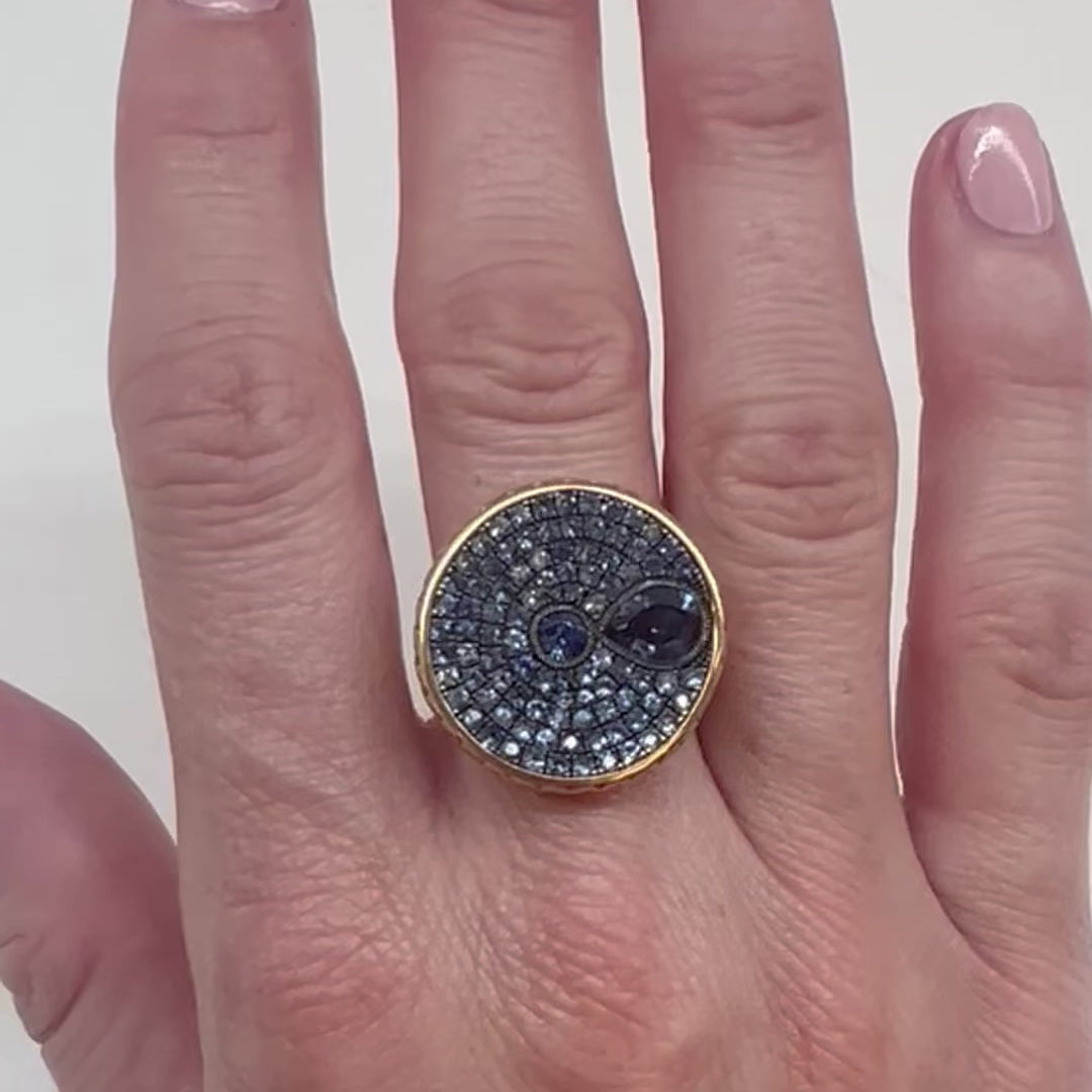 STONE TYPE/CARAT WEIGHT: Sapphire center round & pear 1.22cts, pave 1.65cts