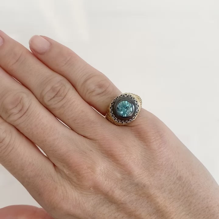 This jaw-dropping ring puts this stunning blue Cambodian zircon front and center. The stone is bezel set in oxidized silver with a pave diamond surround which enhances the sparkle and glamour of the piece. It is comfortable to wear everyday or an excellent choice for an engagement ring.
