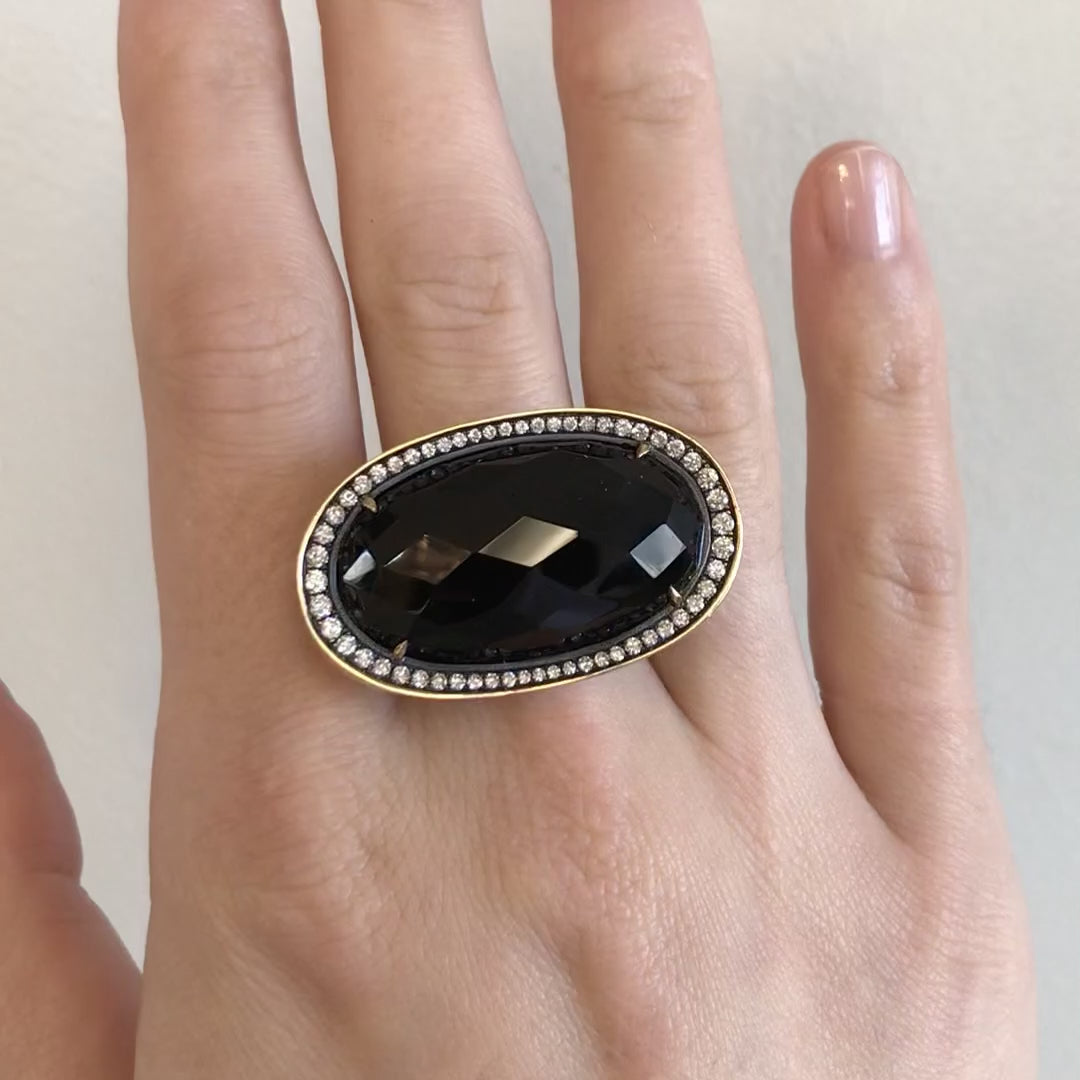 This large east west statement ring features claw set checkerboard cut onyx surrounded by diamonds set in oxidized silver. The ring style is a classic 50s vibe with a modern twist thanks to our crownwork®. The setting is open, airy and the beauty of the stones really shine through and pack a hefty visual punch.