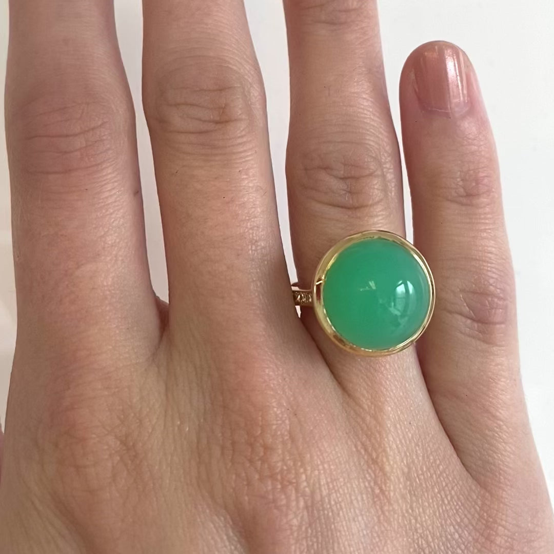 The star of the show in this ring is the cabochon chrysoprase and the only way to highlight such a beautiful and bright stone is with a crisp bezel setting. Diamond shoulders add a little extra sparkle.