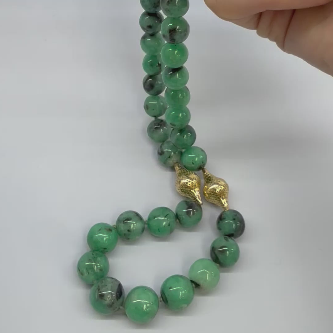 This Colombian emerald sphere bead necklace is a celebration of this beautiful stone. It is strung with two of our signature crownwork® medium finials and finished with an 18k yellow gold lillypad clasp. This is the perfect piece for the lover of cooler tones, layer with other necklaces or wear as a statement on its own.