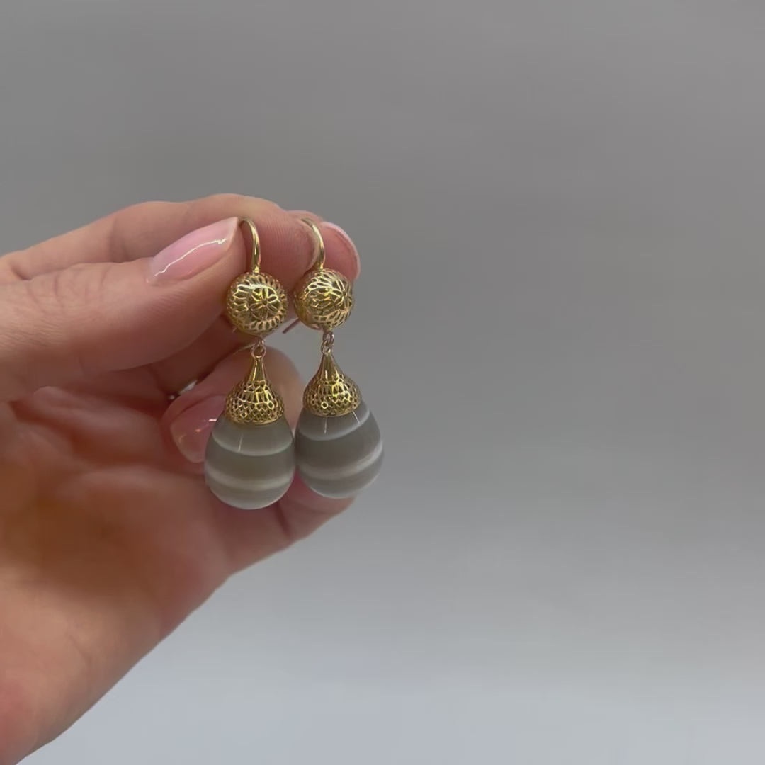 These beautiful drop earrings showcase the naturally occurring banding in agate. The 10mm crownwork® tops bring a touch of movement to the earrings. The hooks are made from high tensile 18k spring wire so they sit nice and tight to the earlobe and drape beautifully. A beautiful match of natural stone and shiny 18k yellow gold these can be be worn with a casual jeans and tee or black evening dress.