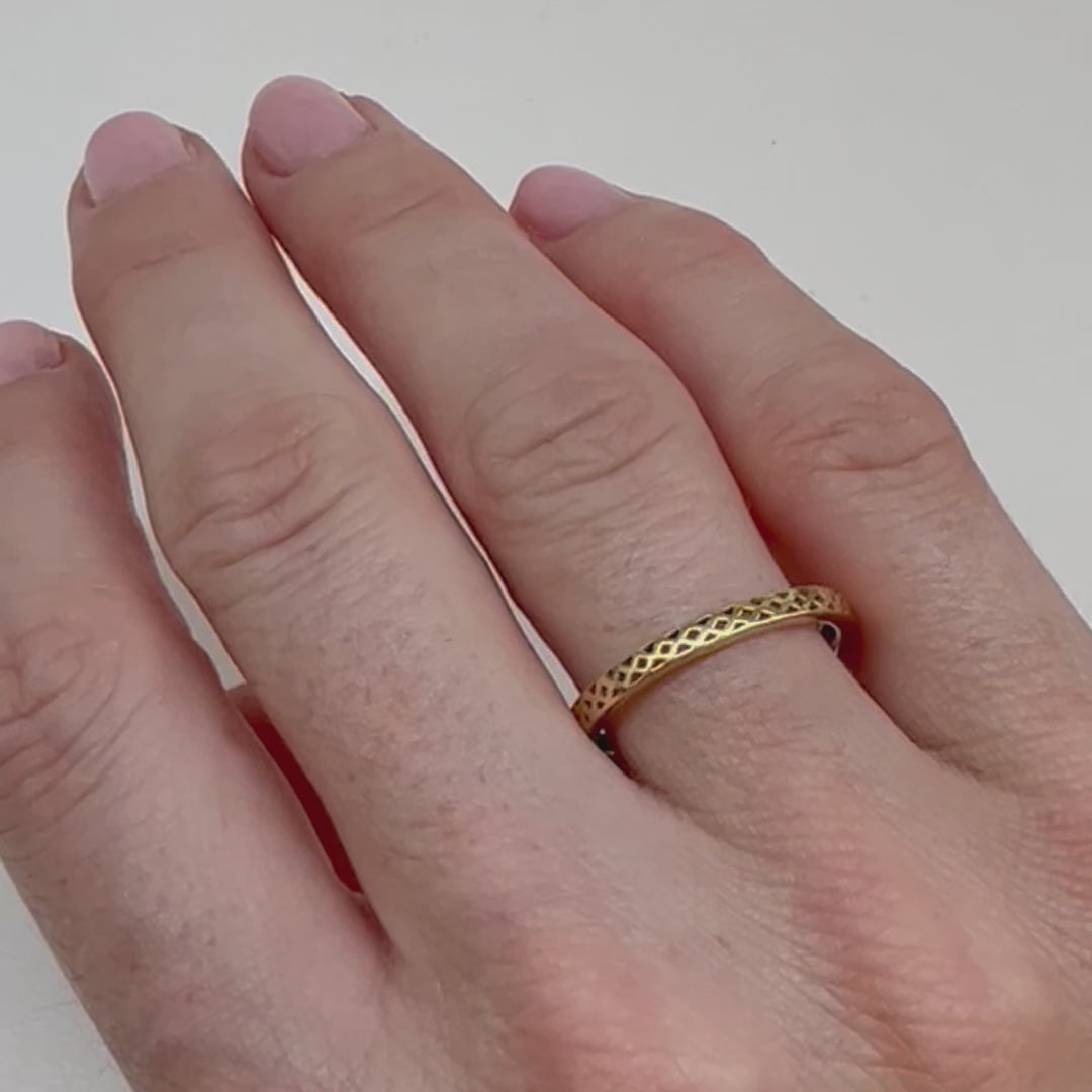 This is our classic crownwork® stacker band. This ring showcases our open gridwork design in a simple and elegant band. It’s versatility lends itself to being stacked or worn alone. This piece is made to order in your desired size.