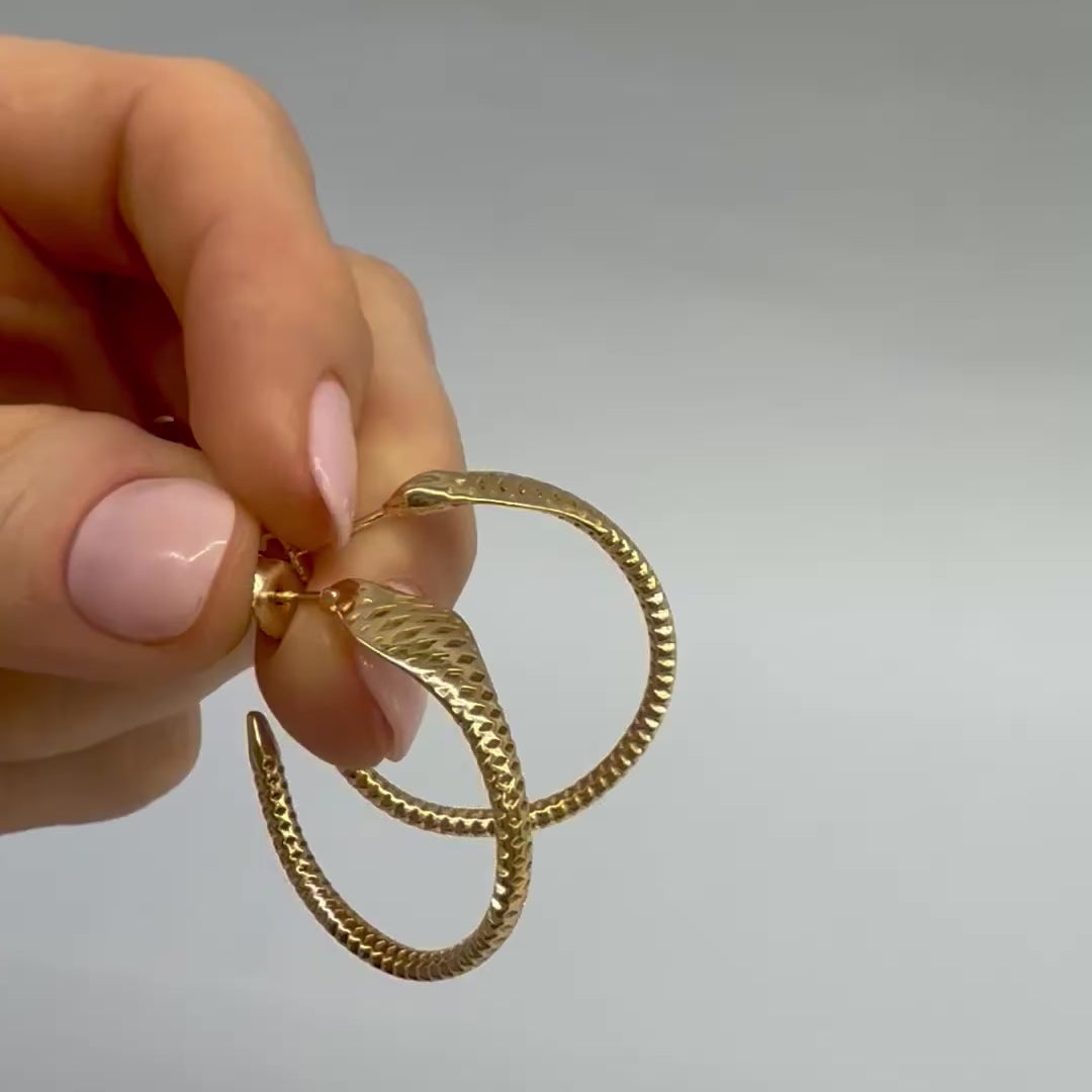 Inspired by the mesmerizing beauty of a cobra hooding, these stunning Snake Hoop Earrings feature our signature 18k Crownwork® grid pattern, meticulously designed to emulate the intricate scales of a serpent.