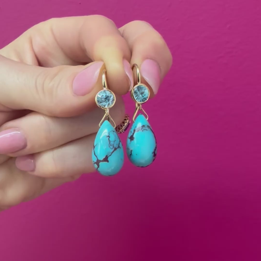 These beautiful earrings feature sparkling blue zircons paired with one-of-a-kind turquoise drops, creating a stunning oceanic color palette. The vibrant blue zircon catches light beautifully on top, while the natural turquoise drops showcase unique matrix patterns. Our earring hooks are crafted from high tensile 18k spring wire that slips on and off effortlessly for comfortable everyday wear.