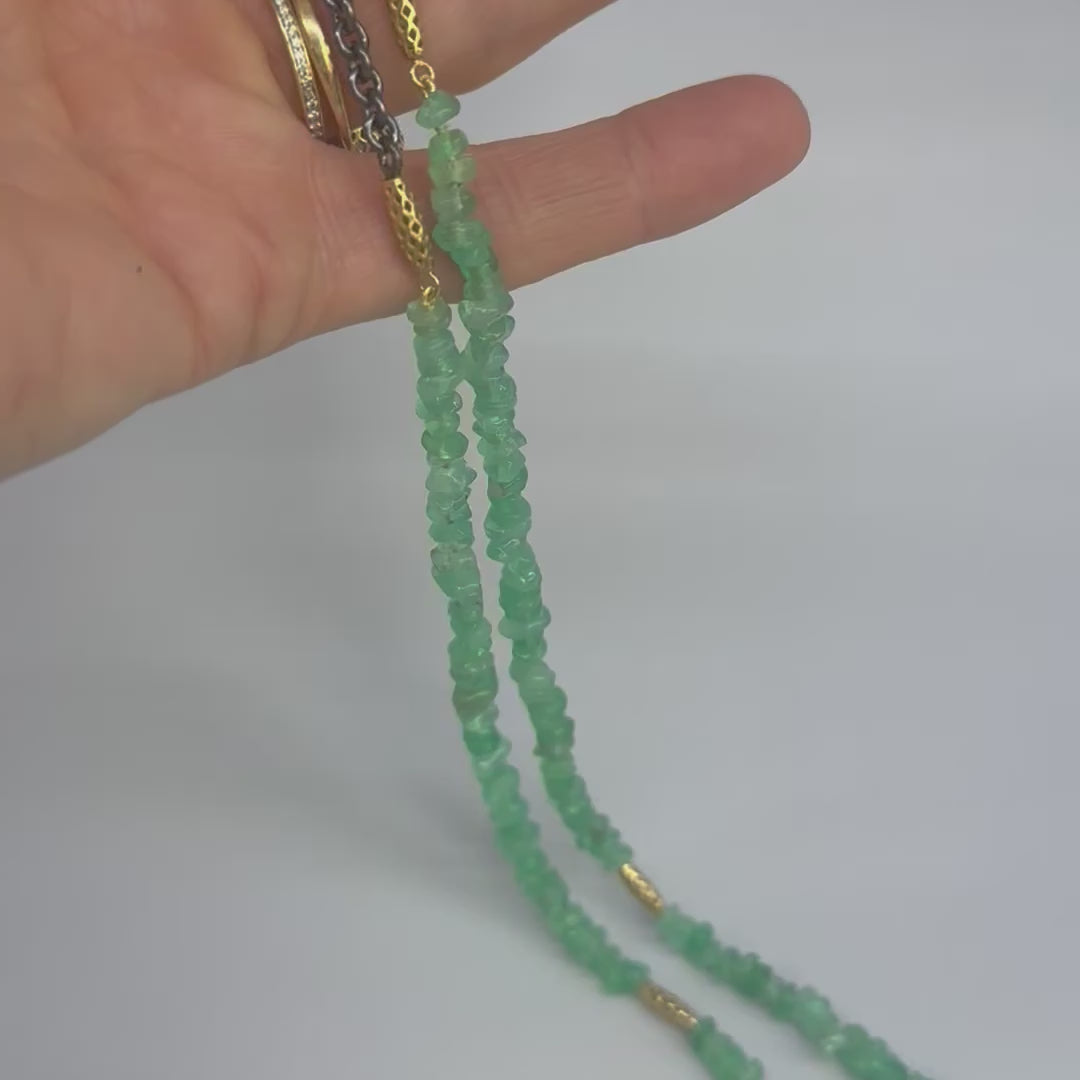 This stunning necklace features a string of graduated Colombian emeralds, strung with four 18k yellow gold Crownwork® rondelles and finished with oxidized silver chain in the back.