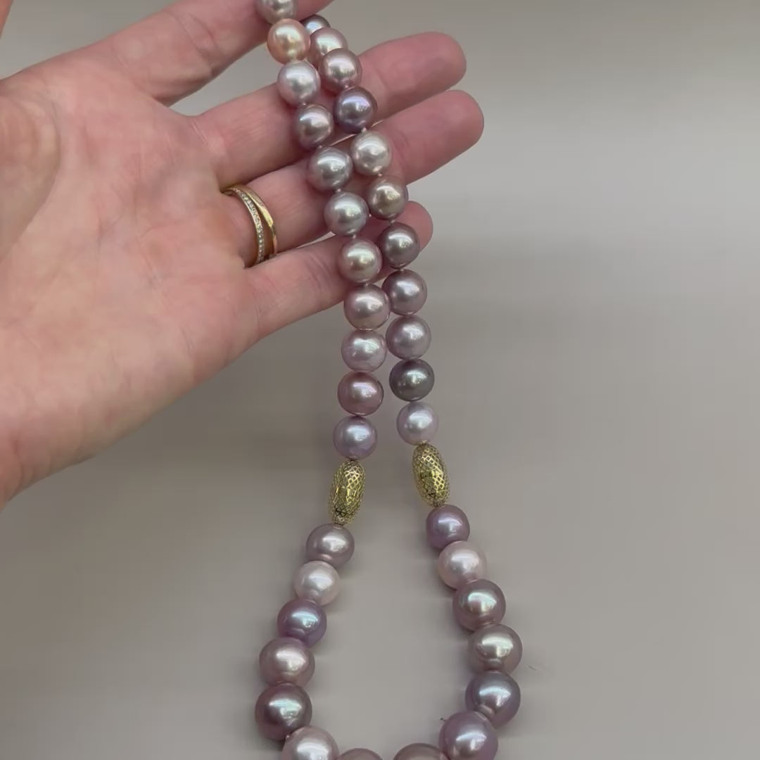This stunning graduated necklace showcases an exquisite spectrum of multicolored freshwater pearls, creating a captivating ombré effect. Each pearl is carefully selected and arranged to transition seamlessly through gentle hues, celebrating the natural beauty and luminosity of these treasured gems.