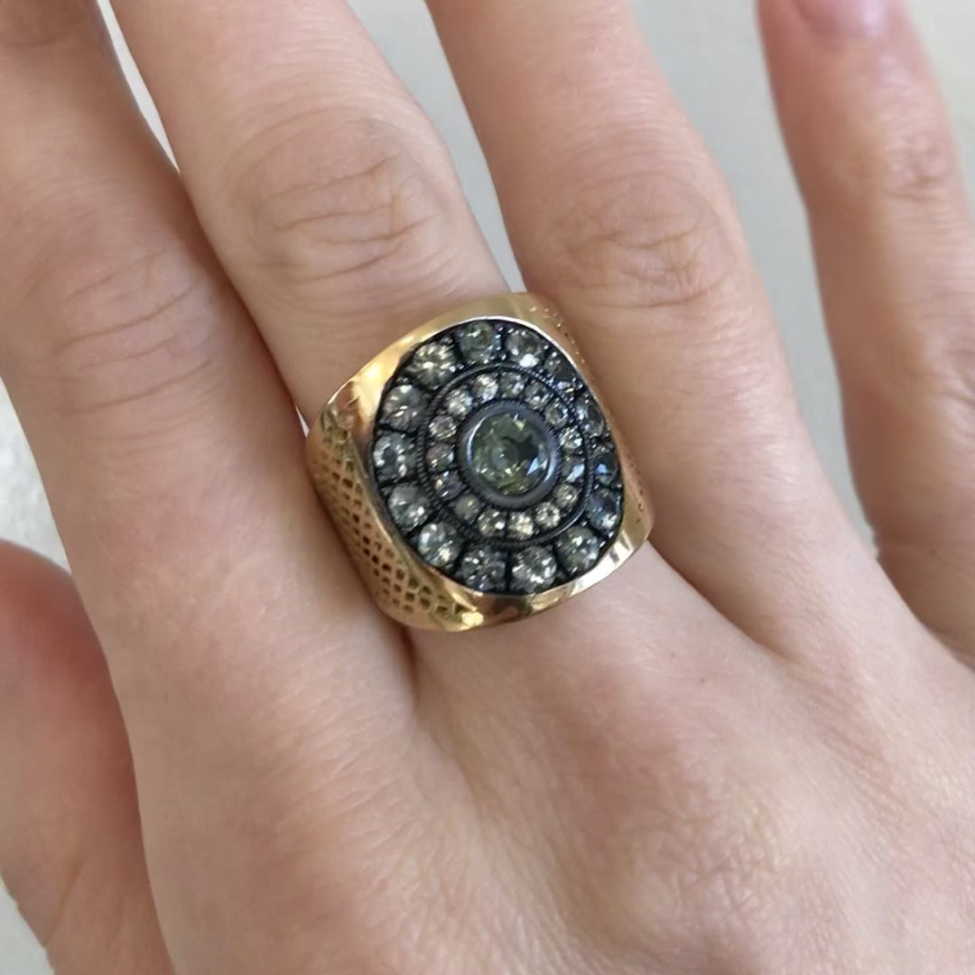 This beautiful crownwork® cigar band ring organically curves around your finger and envelopes it in 18k yellow gold and green sapphires set in oxidized silver for a strong pop of color. A comfortable and chic ring you will reach for every day.