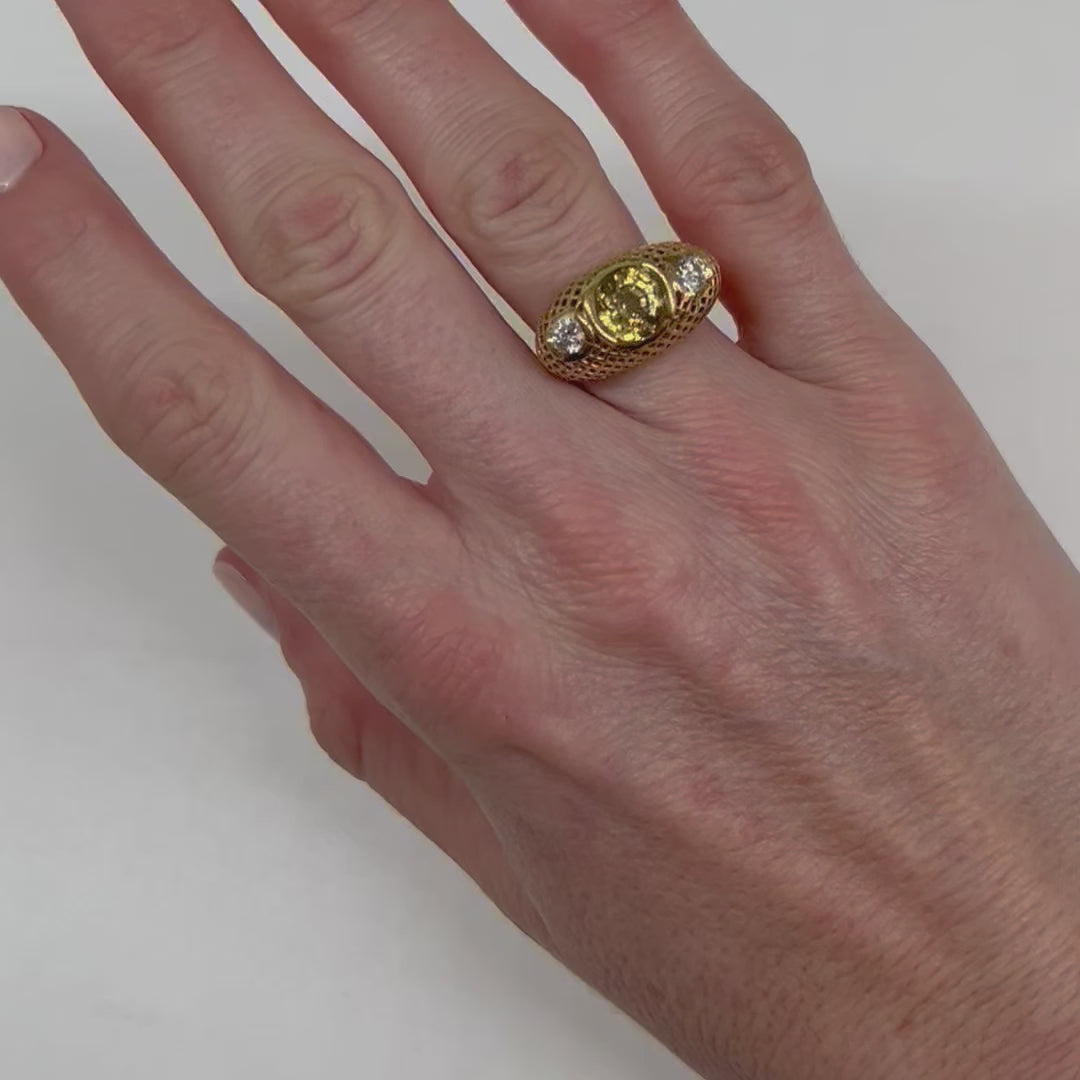 This dome style 18k yelllow gold crownwork® ring hugs your finger and is the perfect size and shape for everyday. The center stone is a punchy green zircon flanked by 2 diamonds, also works well as an engagement ring.