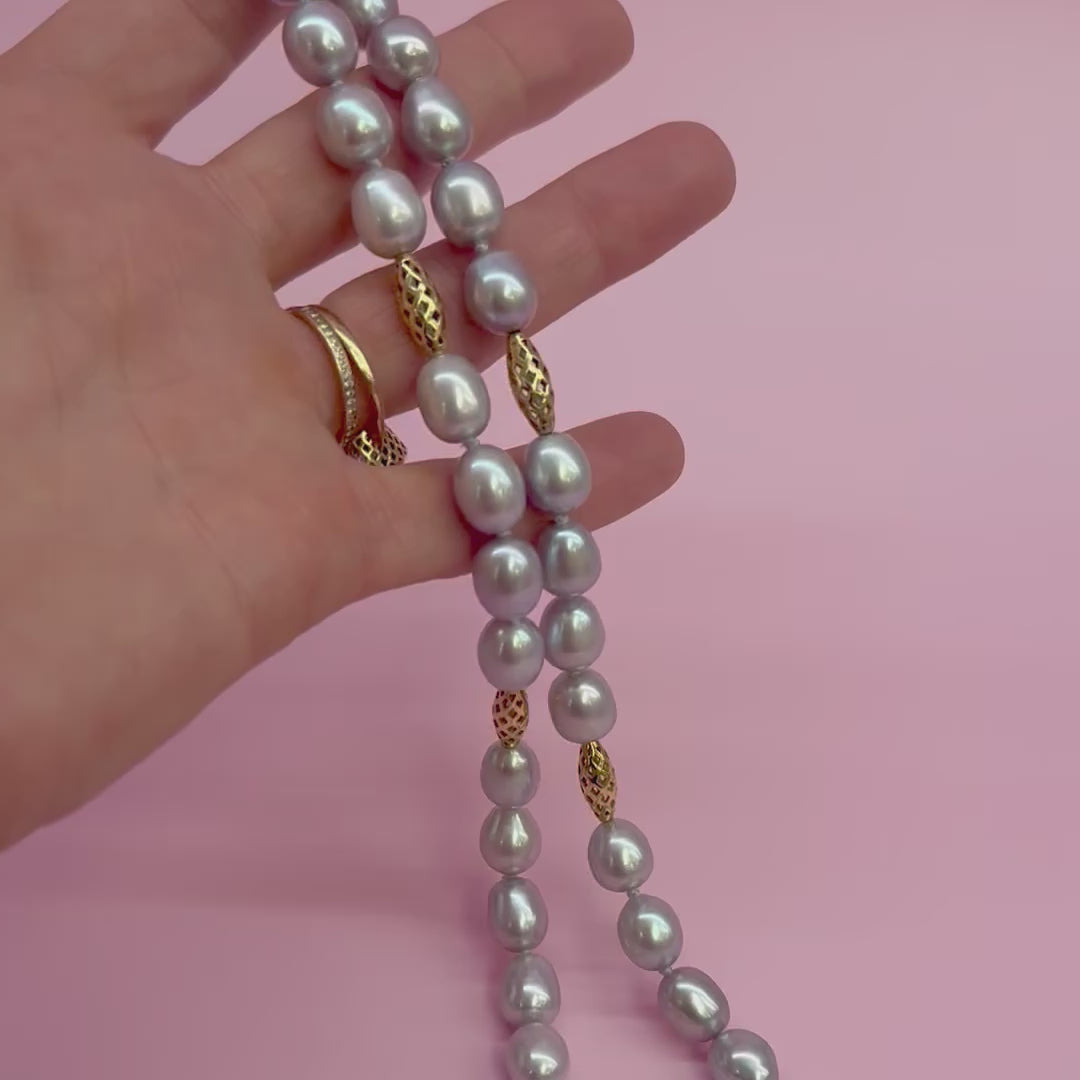 This is our beautiful grey pearl necklace with our signature crownwork® 18k barrel beads. These are platinum grey freshwater pearls which have been hand selected for their quality and beauty. This is a classic piece for every wardrobe to be handed down for generations to come.