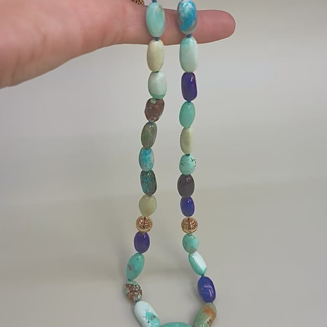 Each stone in this lapis and turquoise beaded necklace showcases its own unique pattern and character, making this piece truly one-of-a-kind. It is strung with two of our signature crownwork® finials, a classic shape inspired by the magnificent Moorish castles of Spain. Completing this fabulous design is our crownwork® small lilypad clasp in matching 18k yellow gold, keeping your necklace snug and secure on your neck.