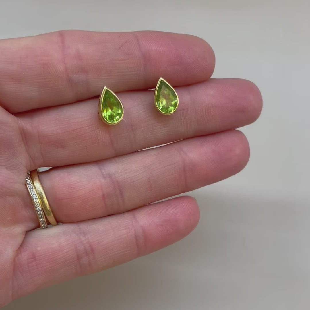 These classic, timeless stud earrings feature the signature 18k yellow gold disc crownwork® with bezel set pear shaped peridot. They are easy to wear and will quickly become your go to earring adding a touch of color and a little extra luxe to your simplest outfits.