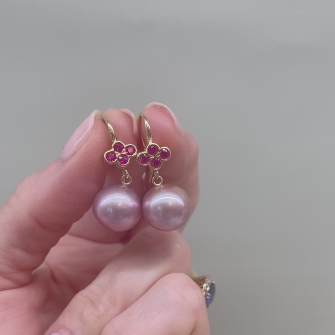 Pink Freshwater Pearl Earrings with Pink Sapphire Clover Tops
