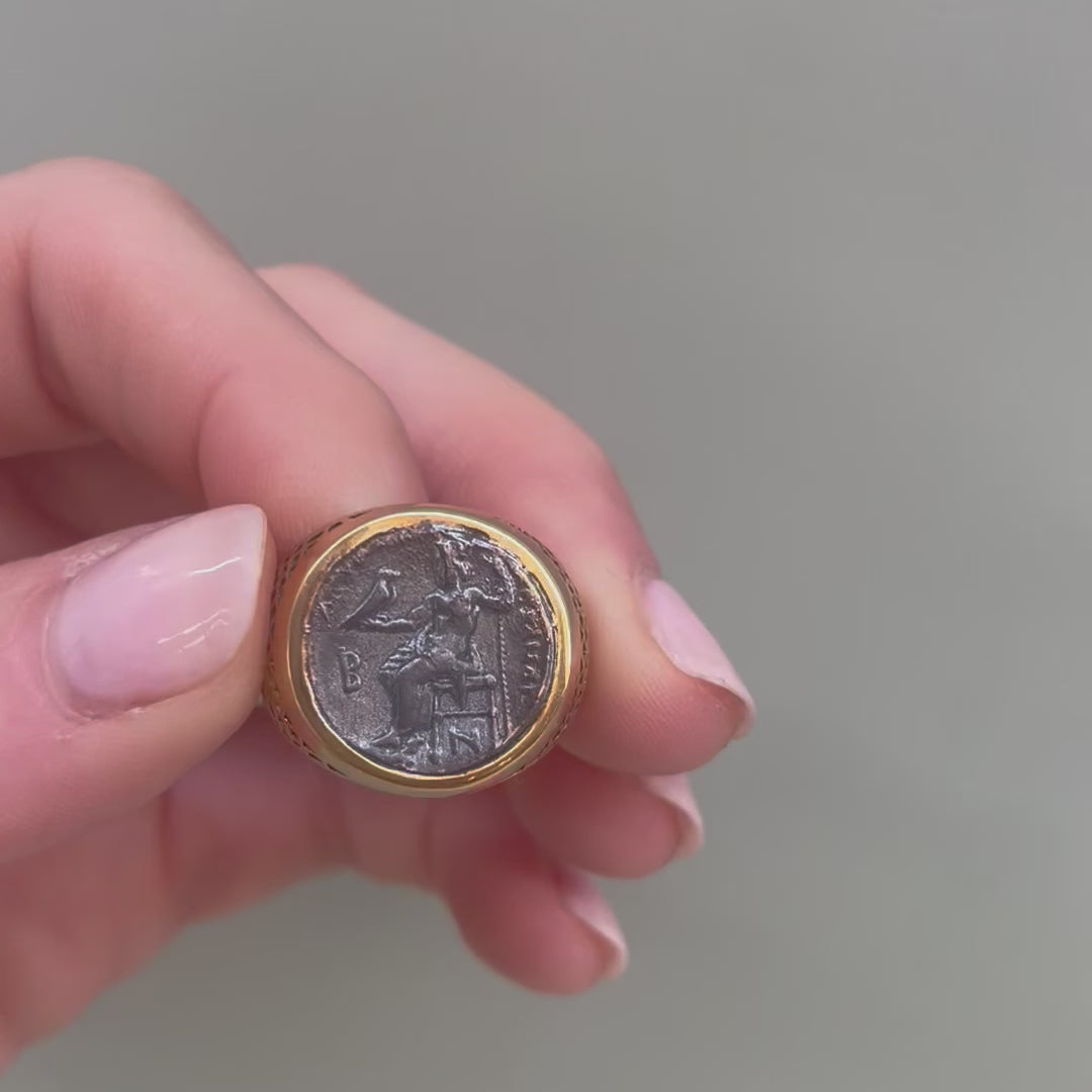 The design of this signet ring is based off a pontiff intaglio ring for wax seals. The coin set in the ring is an oxidized silver casting of a vintage greek coin featuring Alexander The Great.