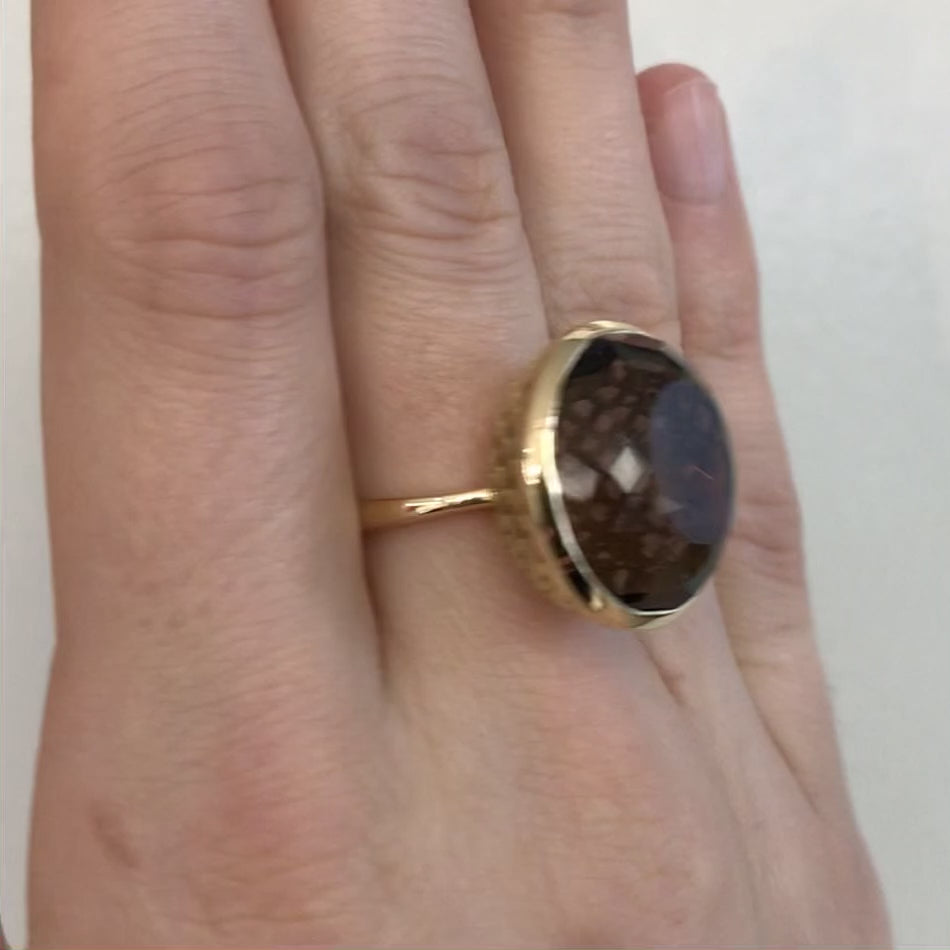 This oval smoky quartz is given a nice sharp bezel setting to really show off the beauty of the stone. The shank is tapered, which really shows off the crownwork® for a super chic finish.