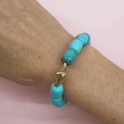 Our stretchy beaded bracelets are your go to everyday piece, wear them solo or stack them. This chic bracelet features beautiful Sonoran turquoise beads, showcasing the stone's vivid blue hue and distinctive natural matrix patterns. The beads are threaded on durable stretch nylon for long term wearability and comfort, then finished with one of our trademark 18k gold Crownwork® finials for a golden pop.