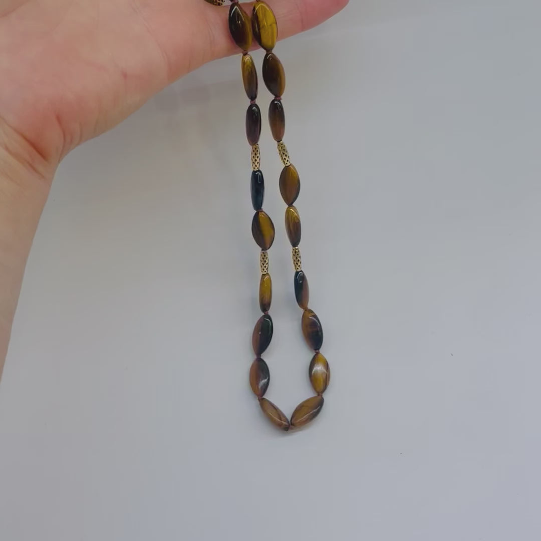 This auspicious tiger's eye beaded necklace is a celebration of this beautiful stone. It is strung with four of our signature crownwork® barrel beads and finished with an 18k yellow gold lilypad clasp. This one of a kind piece looks great layered with other necklaces or worn as a statement on its own.