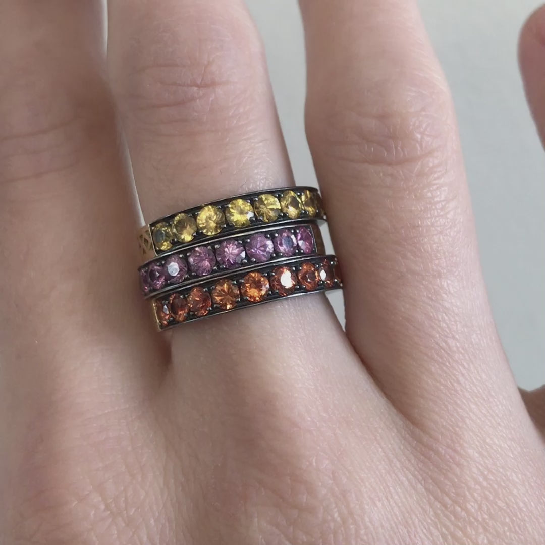 This our take on a classic 1920s eternity band, we make them in a lot of different stones and colors and they look beautiful stacked up together. The band is a mix of 18k yellow gold and oxidized silver, which makes the stones really pop and is a super chic contrast to the yellow gold. This is a timeless must for every jewelry collection.